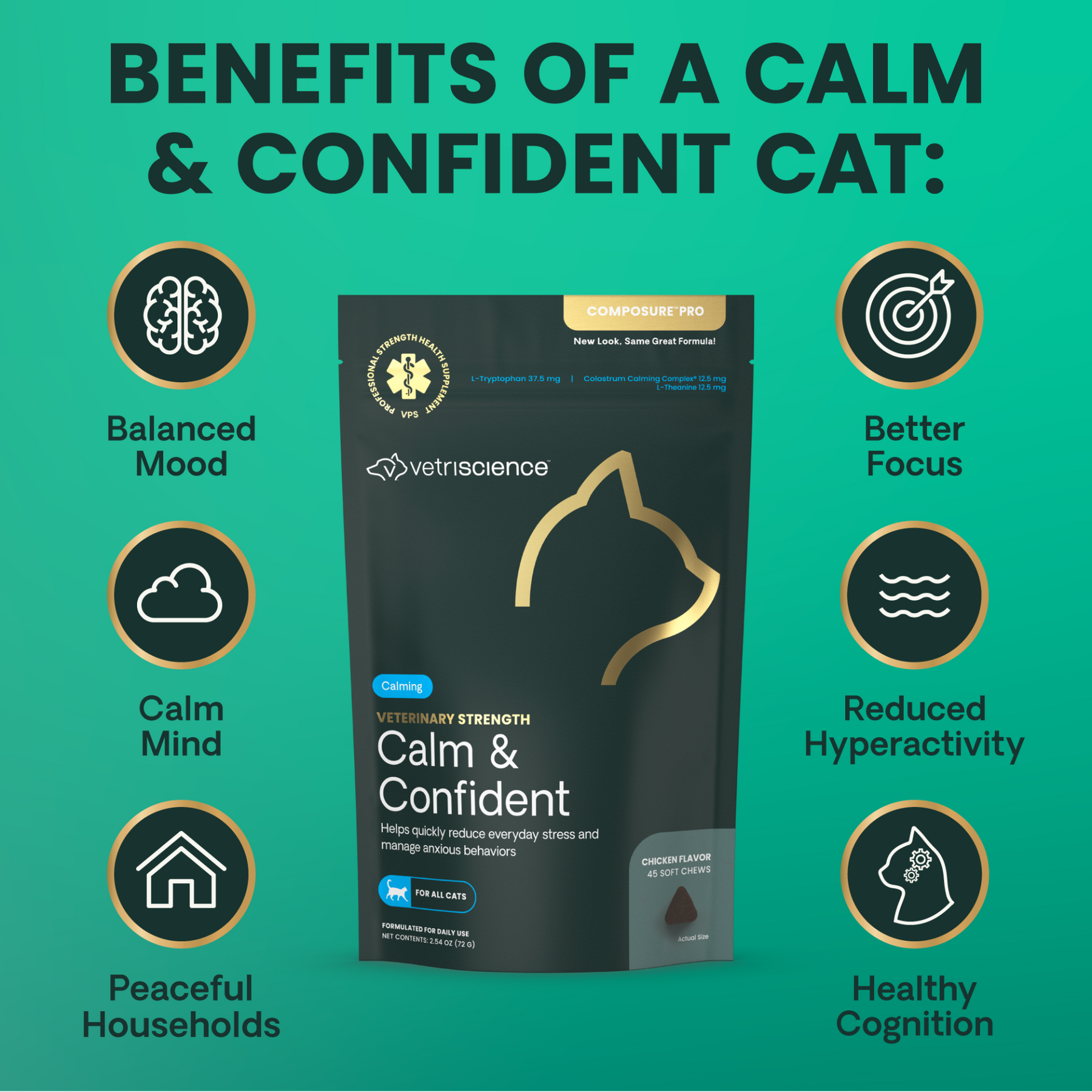 Veterinary Strength Calm & Confident for Cats is a clinical strength calming supplement for cats. It typically works within 30 minutes and lasts up to 4 hours. Veterinary Strength Calm & Confident combines four effective including Colostrum Calming Complex®, L-theanine and L-tryptophan to provide advanced behavioral and cognitive support. Veterinary Strength Calm & Confident is recommended for traveling, thunderstorms, fireworks, veterinary visits and routine changes. These chicken liver-flavored chews are perfectly sized for cats with added flavoring for picky eaters.