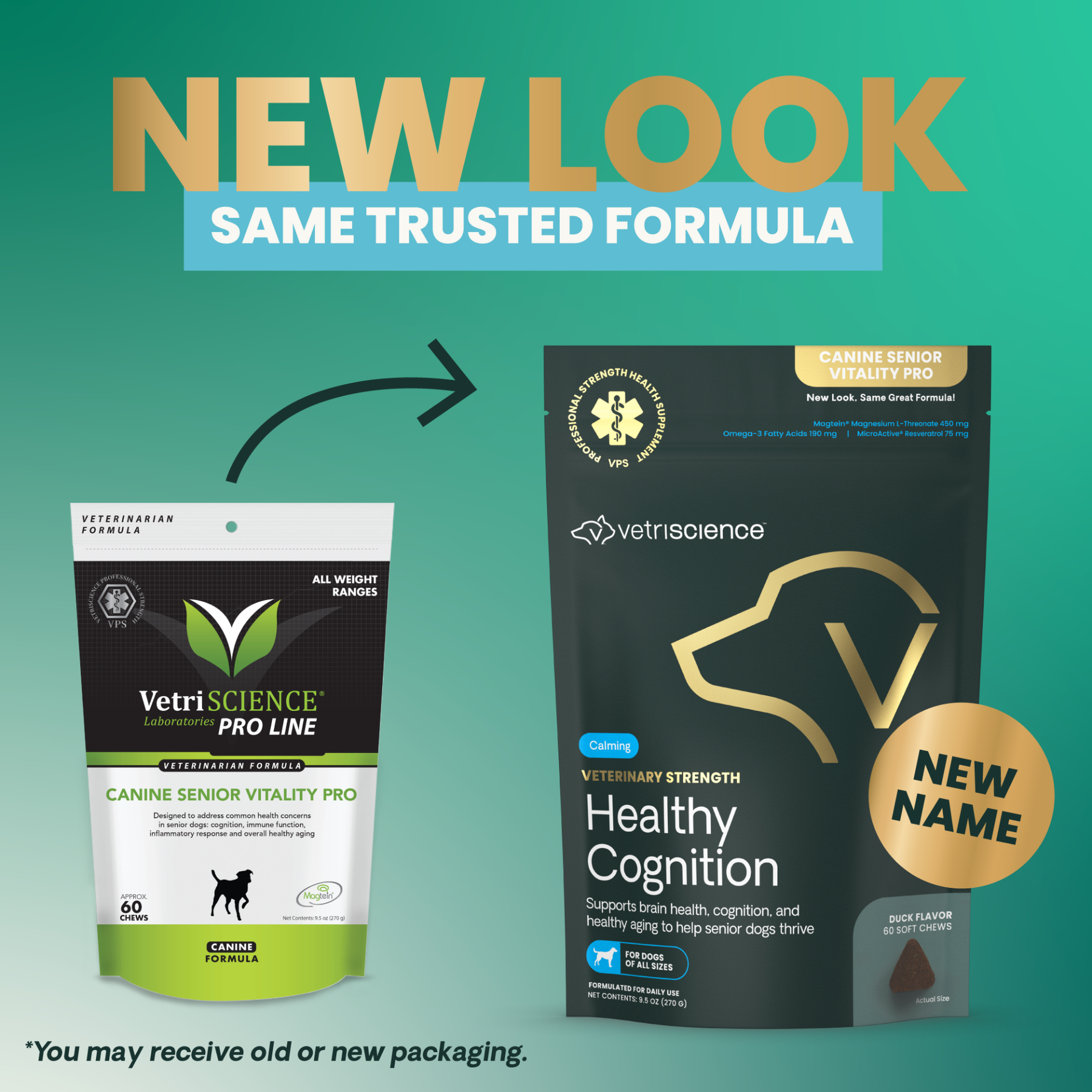 Vet Strength Healthy Cognition (formerly Canine Senior Vitality Pro) is a cognitive supplement for dogs designed to address common health concerns in senior dogs: cognition, immune function, inflammatory response and overall healthy aging.