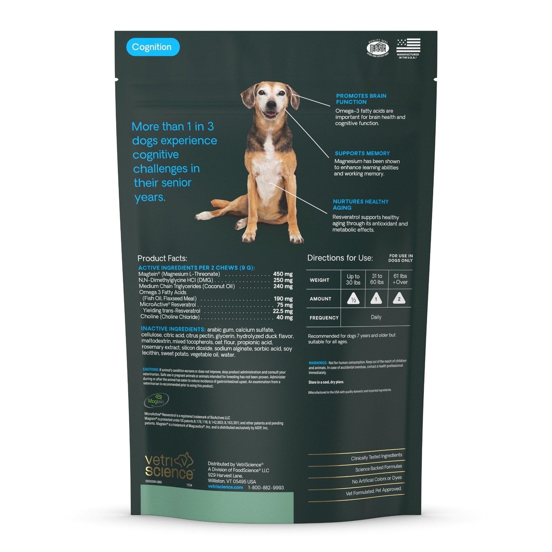 Veterinary Strength Healthy Cognition is a single chew to help fight effects of aging in senior dogs. It’s designed to address multiple health concerns such as cognitive, inflammatory, immune and metabolic functions. It’s powered by extensively researched ingredients to deliver maximum health benefits. This groundbreaking canine supplement is formulated with Magtein®, which is clinically shown to support cognition and brain health in senior dogs.