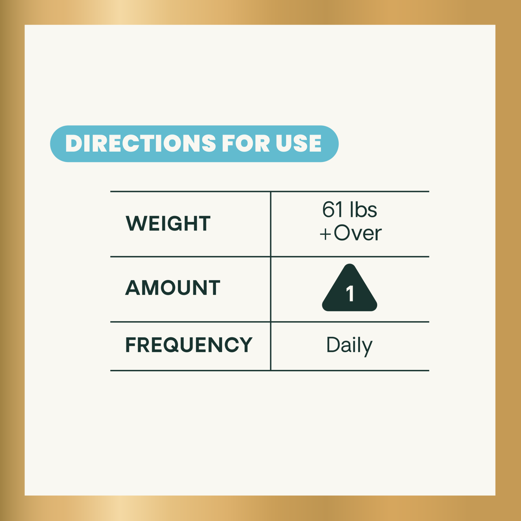 Vetrinary Strength Healthy Hip & Joint is our most advanced joint support formula dogs over 60 pounds. It combines the Extra Strength Healthy Hip & Joint formula with ingredients extracted using Phytosome More Bioavailable® for superior bioavailability. The phytosome complex easily crosses the gut barrier resulting in improved nutrient absorption and significantly higher blood levels. By supporting a healthy inflammatory response, Veterinary Strength Healthy Hip & Joint provides clinical strength joint support to dogs over 60 pounds with advanced conditions. Pets love these delicious chicken liver-flavored chews that are suitable for sensitive diets.