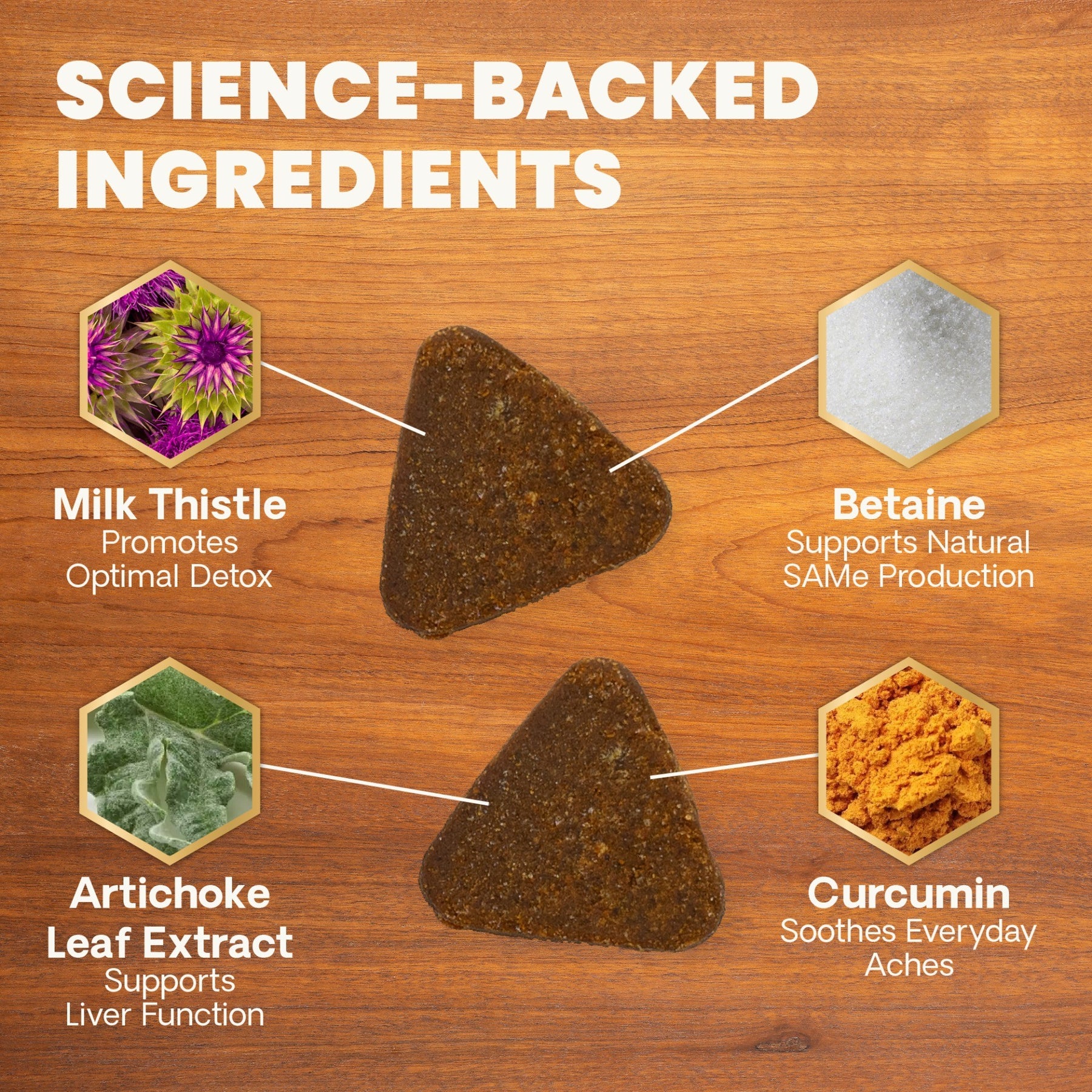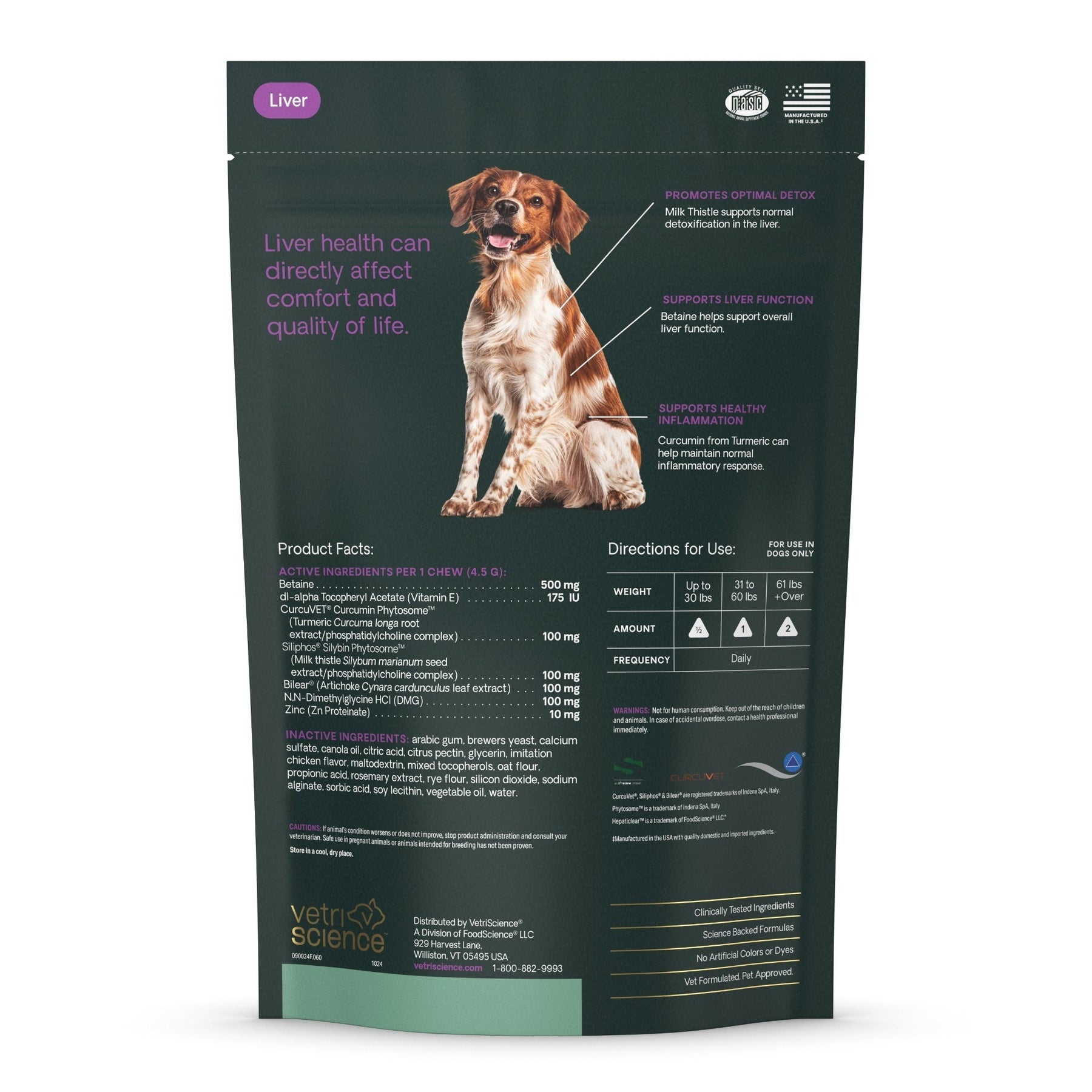 Veterinary Strength Liver Health for Dogs is a powerful formula containing antioxidant plant extracts in phytosome form to support liver health and proper detoxification. It features CurcuVET®, curcumin in phytosome form, which is 30 times more bioavailable than other standard extracts. With immunological supportive substances like DMG and betaine, this formula offers advanced support for normal phases of the detoxification process. It does not require fasting like other liver health supplements.